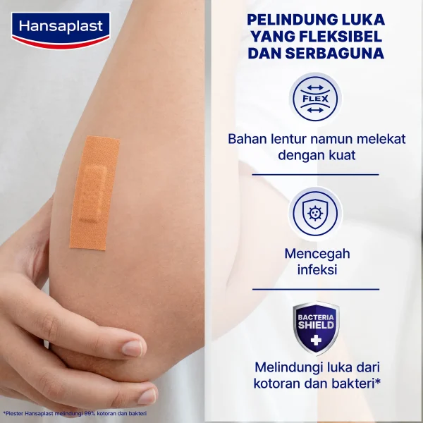 Hansaplast Kain Elastis merupakan plester serba guna untuk semua jenis luka ringan. Melindungi dari kotoran dan bakteri, dan mencegah infeksi pada luka. Dengan kain yang lentur dan berpori dapat membuat kulit leluasa bernapas serta dapat mengikuti pergerakan Anda untuk pemakaian yang nyaman. Bantalan luka yang tidak lengket, melindungi luka sehingga plester dapat dilepaskan dengan mudah dan tidak sakit. Plester melekat kuat sehingga tidak mudah lepas